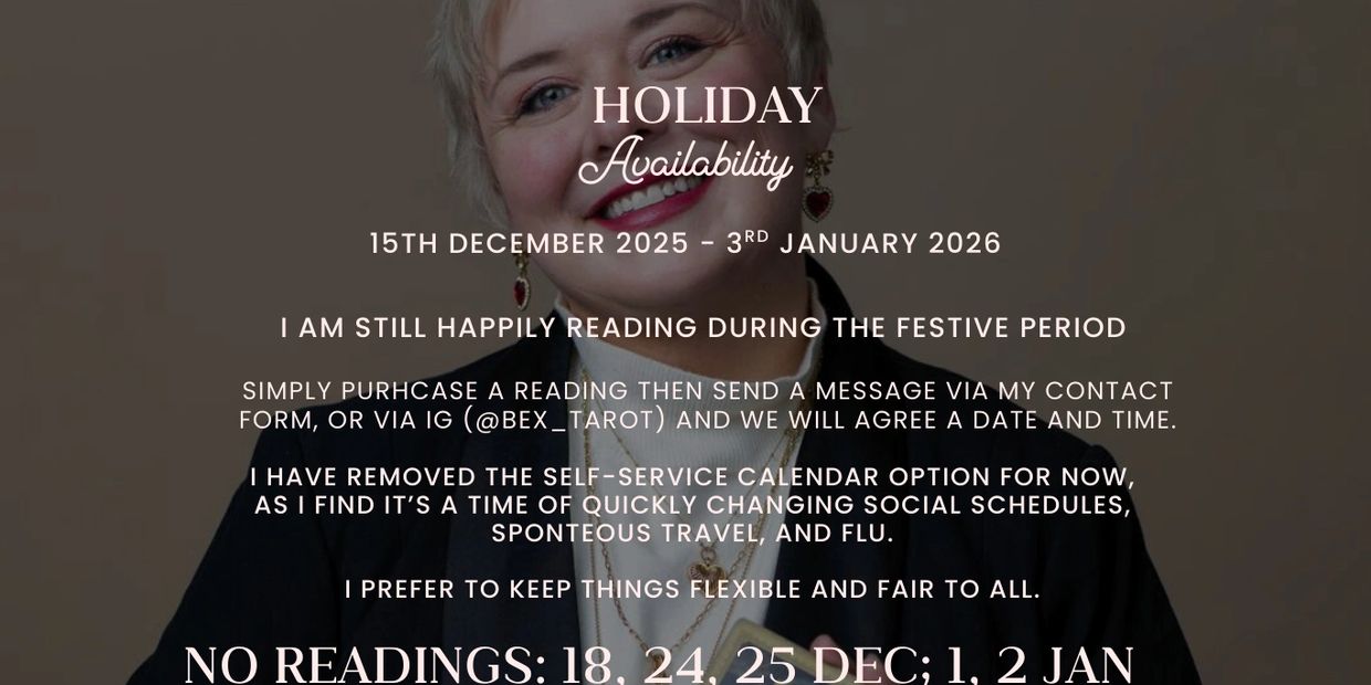 I am still around and happily giving readings. Simply purchase your reading and then DM me to agree a date and time. Let's get you some answers and peer into the promise and potential of 2026. Curious about career, business, relationships, moves across the world, or the outlook for creative projects and partherships? Together we'll explore all the questions on your heart. NB: Readings all via Zoom during these dates. The option for in-person readings in SE London resume from 3rd of January.